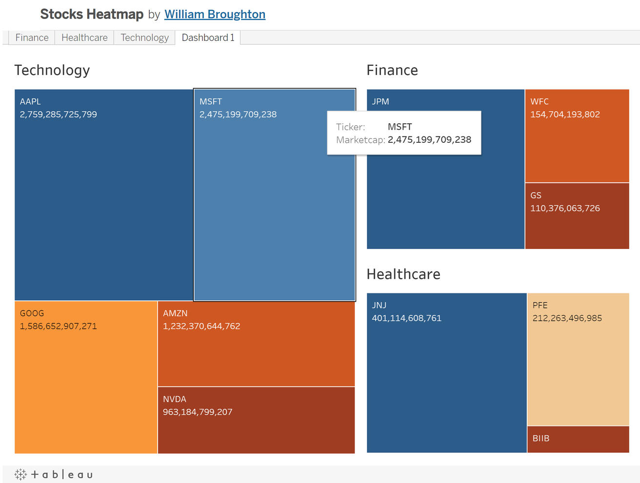 In this visual, we utilize Google Finance to extract 11 stocks between the NASDAQ & NYSE, in order to build a heatmap.